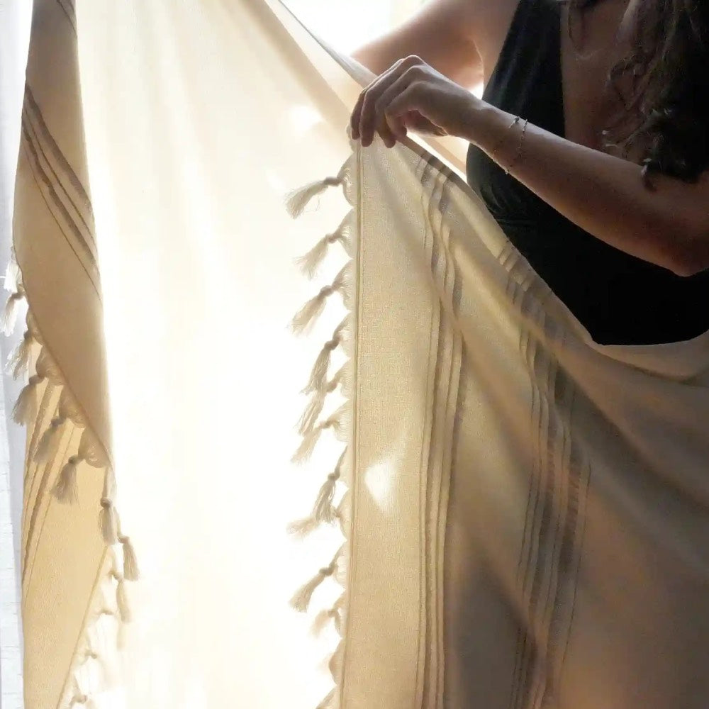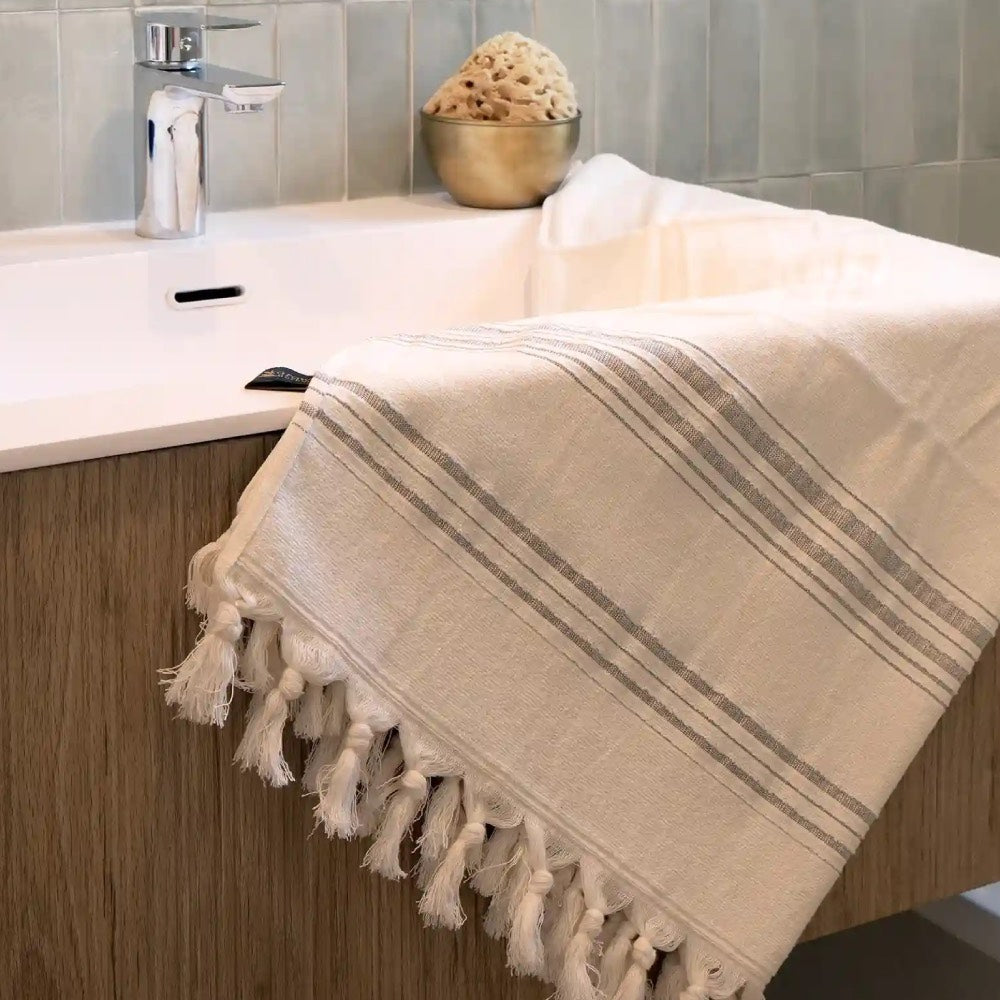 Auf vielfachen Wunsch unserer Kundinnen und Kunden gibt es wieder ein Hamamtuch mit Frottee: Die Fouta Frottee stammt aus einer familiengeführten Weberei in der Türkei und wird unter Einhaltung von sozialen und ökologischen Standars gewebt. Die Fouta Frottee ist schön leicht; auf der einen Seite glatt wie ein Hamamtuch, auf der anderen Seite findet sich superweicher Frottee.''